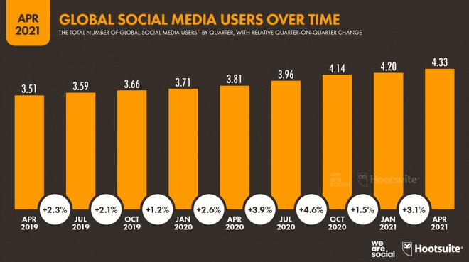 De acordo com uma pesquisa promovida pela Hootsuite em parceria com a agência We Are Social cerca de 4,33 bilhões de pessoas estão em alguma rede social, isso é metade da população mundial. Acesse o relatório aqui.